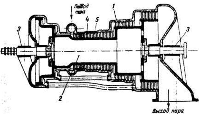 1 - корпус; 2 - вал; 3 - подшипники; 4 - сопловые неподвижные лопатки одной из ступеней; 5 - рабочие подвижные вращающиеся лопатки одной из ступеней.
