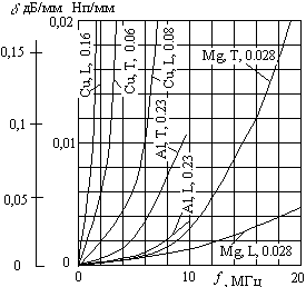Для твердых материалов коэффициент поглощения dп чаще всего пропорционален частоте. Коэффициент dр = 0 для аморфных веществ (стекло, однородные пластмассы). Для поликристаллических веществ dр увеличивается с ростом упругой анизотропии материала (изменении скорости по разным направлениям в кристалле), среднего размера кристаллов D и частоты: dр ~ fn (n изменяется от 2 до 4). В области l / D = 4 …10 величина dр ~ D f2 , а при l > 10 D величина dр ~ D3 f4 .К примеру, в малоуглеродистой стали при l > 10 D для продольных и поперечных волн: