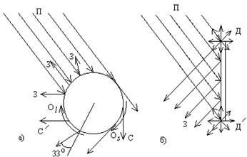При дифракции на объемных дефектах, которые удобно имитировать цилиндром (рис. 2.16,а), дифрагированные волны обегают дефект и соскальзывают. Особенно хорошо волны обегания и соскальзывания наблюдаются при падении на дефект поперечной волны П с колебаниями в плоскости рисунка. При диаметре цилиндра порядка длины волны основной тип волны обегания Оs – рэлеевская, волна соскальзывания С – поперечная, распространяется по касательной к поверхности цилиндра. При диаметре цилиндра значительно большем длины волны хорошо заметна также обегающая волна О. Волна соскальзывания С' при этом – также поперечная, распространяется под углом к поверхности, равном третьему критическому j'.