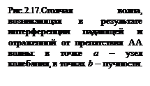 Стоячие волны. Собственные колебания. При падении плоской волны на плоское отражающее препятствие возникает отраженная плоская волна. Если при распространении волн в среде и при отражении их от препятствия не происходит потерь энергии, то амплитуды падающей и отраженной волн равны между собой. Отраженная волна интерферирует с падающей волной, в результате чего в тех точках, куда падающая и отраженная волны приходят в противофазе, результирующая амплитуда падает до нуля, т.е. точки все время остаются в покое, образуя неподвижные узлы колебаний, а в тех местах, где фазы волн совпадают, волны усиливают друг друга, образуя пучности колебаний. В результате получается т. н. стоячая волна (рис.2.17). В стоячей волне поток энергии отсутствует: энергия в ней (при условии, что потерь нет) перемещается только в пределах, ограниченных смежным узлом и пучностью. Стоячая волна может существовать также и в ограниченном объеме. В частности, в случае, изображенном на рис. 2.17, слева, на месте ВВ, можно вообразить себе такое же препятствие, что и справа, между двумя стенками будет существовать стоячая волна, если расстояние между ними равно целому числу полуволн. Вообще стоячая волна может существовать в ограниченном объеме лишь в том случае, если длина волны находится в определенном соотношении с размерами объема. Это условие выполняется для ряда частот f1, f2, f3, … , называемыми собственными частотами данного объема.