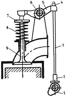 Кулачки 1 распределительного вала, вращаясь, поднимают толкатели 2, движение которых через штанги 3 передается коромыслам 5. Коромысла 5 надеты на ось 6, закрепленную на головке цилиндров. Совершая колебательные движения, коромысла 5 непосредственно воздействуют на стержни клапанов 9, заставляя последние открываться и закрываться в нужные моменты времени.
