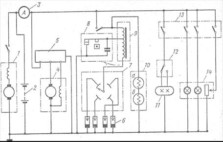 - источники тока (аккумуляторная батарея 2 и генератор 4 с регулятором 5 и амперметром 3), обеспечивающие электроэнергией перечисленные ниже потребители;