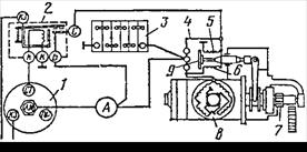 Как только заработает двигатель, в генераторе будет создаваться ЭДС и обмотка реле включения 2 будет находиться под напряжениями генератора и аккумуляторной батареи 3, направленными навстречу друг другу. Магнитное поле реле включения 2 уменьшится и его контакты под действием пружины разомкнутся. Цепь удерживающей обмотки 6 размыкается и сердечник тягового реле 4, а с ним рычаг и медный диск 9 включения вернутся в исходное положение, выключая стартер 8.