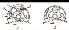 При пуске двигателя (а) усилие с вала якоря стартера передается на шестерни. Как только ведущая обойма начнет вращаться, ролики, переместившись по наклонной поверхности, заклинят ведомую обойму и приводная шестерня начнет вращать маховик.