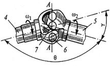 При вращении валов концы крестовины О-О покачиваются относительно плоскости, перпендикулярной к оси ведущего вала. Соотношение между углами поворота ведущего валов (a) и ведомого (b) определяется выражением tga = tgb cosg. Неравномерность вращения тем больше, чем больше угол g между осями валов.