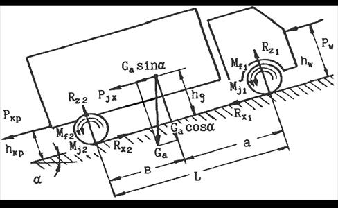 Ко второй группе сил относятся продольные реакции ведомых Rx1 и ведущих Rx2 колес, нормальные реакции опорной поверхности на колеса Rz1 и Rz2. Кроме того, на колеса действуют моменты сопротивления качению Мf1 и Мf2.