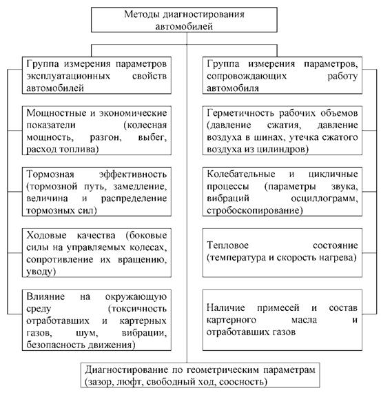 Методы диагностирования автомобилей характеризуются физической сущностью диагностических параметров. Они делятся на две группы: измерения параметров эксплуатационных свойств автомобиля (динамичности, топливной экономичности, безопасности движения, влияния на окружающую среду) и измерения параметров процессов, сопровождающих функционирование автомобиля, его агрегатов и механизмов (нагревы, вибрации, шумы). Кроме того, существует группа методов диагностирования, обеспечивающих измерение геометрических величин, непосредственно характеризующих техническое состояние механизмов автомобилей.