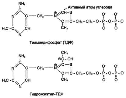 Тиаминдифосфат (ТДФ) и гидроксиэтил-ТДФ. Рабочей частью ТДФ служит тиазоповое кольцо, к которому присоединяется продукт декарбоксилирования пирувата - гидроксиэтил. В активном центре фермента происходит прямое взаимодействие двух атомов углерода с образованием между ними ковалентной связи. Это взаимодействие обусловлено частичными разноименными зарядами, которыми обладают углерод кето-группы пирувата с одной стороны и атом углерода тиазолового кольца тиаминпирофосфата с другой.