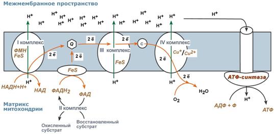 На основании строения и функций компонентов дыхательной цепи предложен механизм окислительного фосфорилирования: