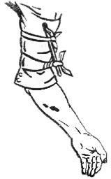 Подручными средствами конечность перетягивают так же как резиновым жгутом, либо делают закрутку, конец которой прибинтовывают к конечности (рис. 8).