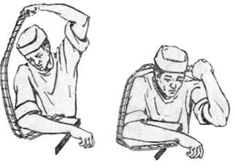 3. Оказывающий помощь, на себе дополнительно изгибает шину по контурам спины, задней поверхности плеча и предплечья.