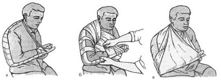 Рис. 12. Транспортная иммобилизация всей верхней конечности лестничной шиной: а – прикладывание шины к верхней конечности и связывание ее концов;б – укрепление шины бинтованием; в – подвешивание руки на косынке