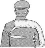 Иммобилизация подручными средствами. Несколько дощечек, кусок толстого картона в виде желоба могут быть уложены с внутренней и наружной поверхности плеча, что создает некоторую неподвижность при переломе. Затем руку помещают на косынку или поддерживают перевязью.