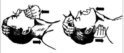 Вначале необходимо обеспечить проходимость дыхательных путей. Восстановления и поддержания проходимости дыхательных путей достигают укладыванием больного на спину и выполнением так называемого «тройного приема», включающего запрокидывание головы, выдвигание нижней челюсти вперед и раскрытие рта.