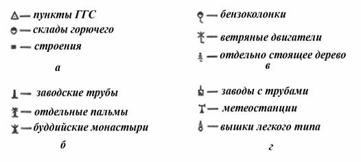 Внемасштабные условные знаки применяются для изображения местных предметов, не выражающихся в масштабе карты (колодцы, отдельно стоящие деревья, дома и т.п.). Эти знаки имеют главную точку, которая совмещается с положением данного объекта на карте (см. рис. 2.5). При определении координат объектов или измерении расстояний между ними необходимо использовать именно главные точки, которые находятся: