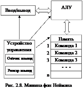 Машина фон Неймана состояла из памяти, представлявшей собой набор регистров, АЛУ, устройства ввода-вывода и устройства управления (рис. 2.8).