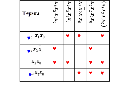 При склеивании снижается ранг термов. Склеивание проводится до тех пор, пока не останется ни одного терма, допускающего склеивание с каким-либо другим термом. Термы, подвергшиеся склеиванию, отмечаются. Неотмеченные термы представляют собой первичные импликанты. После получения множества всех первичных импликант исследуется возможность нахождения простейшей записи ФАЛ. Для этого составляется таблица, в первой строке которой записаны минтермы исходной ФАЛ, а в первом столбце записаны все найденные первичные импликанты. Клетки этой таблицы помечаются в том случае, если первичная импликанта входит в состав какого-либо минтерма исходной ФАЛ. После этого задача упрощения сводится к тому, чтобы найти такое минимальное количество первичных импликант, которые покрывают все столбцы минтермов исходной ФАЛ.