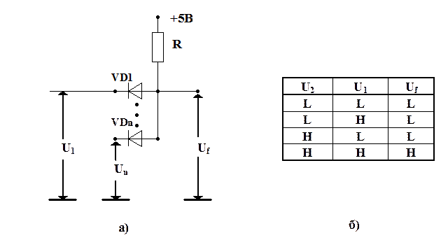 По схеме логического элемента видно, что выходное напряжение Uf , будет иметь малую величину, равную напряжению на полупроводниковом диоде (примерно 0,5 В), если хотя бы одно напряжение на входах U1,...,Un будет равно нулю. Для двухвходового варианта логического элемента на рис.10б) приведена таблица истинности для физических уровней выходного напряжения этой схемы (L(ow) - низкий уровень напряжения, H(igh) - высокий уровень).