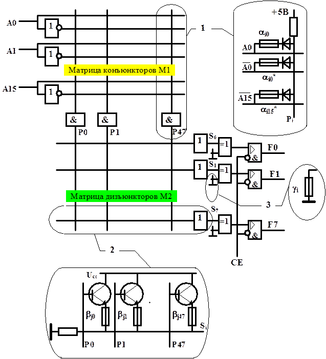 Первый логический уровень включает матрицу из 48 схем И (конъюнкторов), организующую логические произведения (конъюнкции) Pi от входных переменных Аm и их инверсий