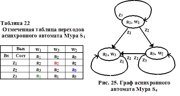 Пример асинхронного цифрового автомата Мура S4 приведён в отмеченной таблице 22, а его граф - на рис.25. Очевидно, что все его состояния устойчивы. Если в таблице переходов асинхронного цифрового автомата некоторое состояние as стоит на пересечении строки zf и столбца am (m ¹ s), то это же состояние as обязательно должно встретиться в этой же строке в столбце as. В графе асинхронного цифрового автомата, если в некоторое состояние as имеются переходы из других состояний под действием каких-то сигналов, то в вершине as должна быть петля, отмеченная символами тех же входных сигналов.