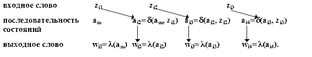 Точно так же описывается поведение автомата Мура, находящегося в состоянии am, при приходе входного слова zi1, zi2, ... , zik. Учитывая, что выходной сигнал автомата Мура в момент времени t, то есть w(t), зависит лишь от состояния, в котором находится автомат в момент t, то есть от a(t), получим: