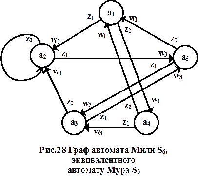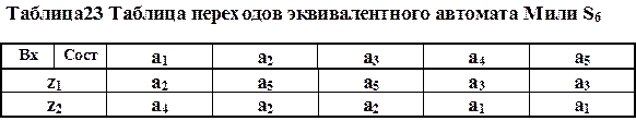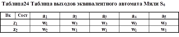 Пример трансформации автомата Мура S3 (таблица 21) в автомат Мили S6 приведён на рис.28 и в таблице 23 и таблице 24.