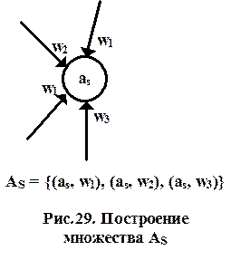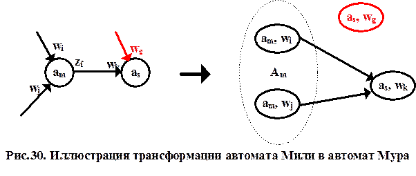 Для определения AB каждому состоянию as Î AA поставим в соответствие множество AS всевозможных пар вида (as, wg), где wg - выходной сигнал, приписанный входящей в as дуге. Это положение иллюстрируется примером преобразования фрагмента автомата Мили на рис.29.