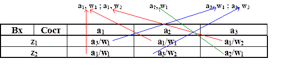 На вход этого автомата, установленного в начальное состояние a1, поступает шестибуквенное (шеститактное) слово x=z1z1z2z1z2z2.
