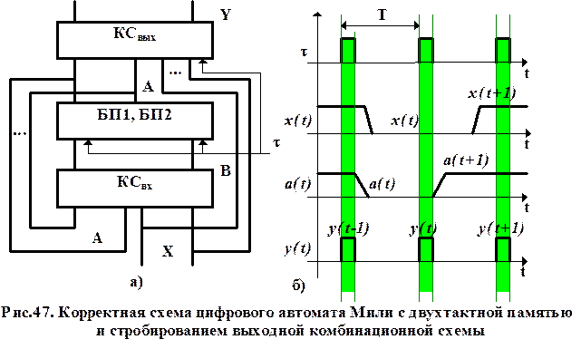 Структурная схема корректного цифрового автомата Мили и временная диаграмма его работы приведены на рис.47.