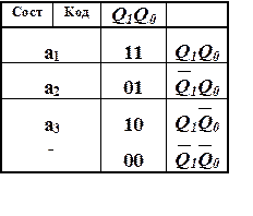 Очевидно, что при кодировании переходов и выходов можно придерживаться двух принципов описания булевых функций. Если желательно получить табличное описание функций выходов с наименьшим количеством единичных значений, то для кодирования часто встречающихся в таблице выходов сигналов следует использовать коды с максимально возможным количеством нулей в коде, а для кодирования следующих по количеству ссылок в таблице выходов сигналов использовать коды с увеличивающимся количеством единиц в кодовых комбинациях. Для кодирования состояний блока памяти на D триггерах также можно использовать этот принцип кодирования, поскольку таблица возбуждений для них совпадает с таблицей переходов. Рекомендовать этот принцип для всеобщего применения при синтезе автоматов нельзя, так как при минимизации булевых функций возможно получение более простых результирующих форм представления функций, имеющих более сложную запись в СДНФ. Этот принцип можно использовать только в том случае, если ФАЛ выходов и ФАЛ возбуждений для D триггеров не подлежат минимизации, поскольку реализуются на мультиплексорах, дешифраторах или постоянных запоминающих устройствах.