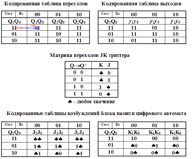 Если в каждую клетку таблицы переходов и выходов записать двоичный код, соответствующий размещённым там состояниям или выходным сигналам цифрового автомата, то таким образом получаются кодированные таблицы переходов и выходов.