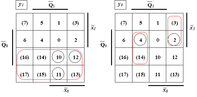 Выполним конкатенацию кодов входных сигналов и кодов состояний по порядку следования переменных x1x0Q1Q0 и заполним таблицу истинности для функций выхода и возбуждений. В таблице на запрещённых наборах входных сигналов и состояний значения функций не определены и обозначены символом красного цвета §к .