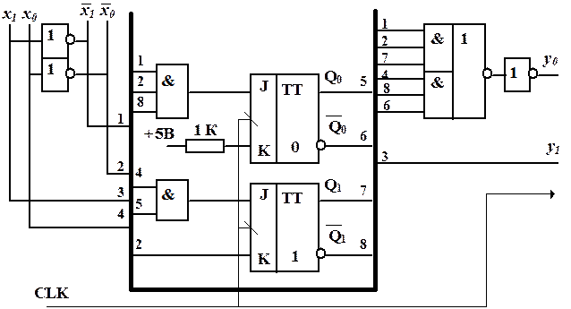 В формулах А и Б функции возбуждения JK триггеров блока памяти не содержат дизъюнкций, а количество переменных в конъюнкции не больше трёх. Для блока памяти следует использовать JK триггеры с встроенной логикой (трёхвходовые конъюнкторы в триггерах типа 155ТВ1). Такие схемы дают большую экономию и повышенную надёжность. Функция К0 «константа 1» задаётся подключением соответствующего входа через резистор сопротивлением 1 кОм к источнику питания схемы (для ТТЛ схем это напряжение равно +5В). Для соединения элементов схемы между собой использован «жгут». Соединены между собой проводники, имеющие одинаковую нумерацию входов в «жгут» и выходов из «жгута».