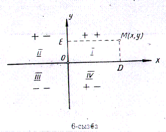 Жазықтықтағы нүктенің координаталары.Жазықтықта бір-біріне перпендикуляр болатын Охпен Oy остерін қарастырайық (6-сызба). Бұл осьтердің қилысатың О нүктесі екі оске жалпы координаталық бас нүкте болсын. Горизонталь Ox осін абсцисса осі деп, вертикаль О у осін ордината осі деп атайық. Абсцисса осінің оң бағытын О бас нүктесінен оңға қарай, ал ордината осінің оң бағытын О нүктесінен жоғары қарай алайық. Сонда осы екі оң бағыттардағы координаталардың таңбалары плюс ( + ), ал бүлбағыттарға қарама-қарсы координаталардың таңбалары минус ( — ) болады. Осы қиылысқан екі ось жазықтықты төртке (І, ІІ, ІІІ,ІV) бөледі (6-сызба).