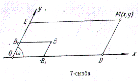 Абсцисса мен ордината осьтері координаталар осьтері деп аталады. В мен В2 нүктелерінің орнына Внүктесін алуға болады. Масштабы еркімізше алынған координаталар жүйесын аффиндік координаталар жүйесі деп атайды. Егер осы екі осьтің (Ох, Оу)бойындағы кесінділер бір масштабпен өлшенсе, яғни m1 = m2 = ОВ2 = ОВ1 = mболса, онда координаталар жүйесы декарттык, координаталар жүйесі деп аталады. Егер екі осьтін, (Ох, Оу) арасындағы бұрыш ω еркімізше (7-сызба) алынса, ондай жүйе қиғаш бурышты координаталар жүйесі деп аталады. Егер бұрыш ω = π/2 болса, ондай жүйе тік бұрышты немесе ортогональдық координаталар жүйесі деп аталады. Біз тік бұрышты декарттық координаталар жүйесін пайдаланамыз. Декарттык координаталар жүйесі болу үшін мынадай шарттар: 1) координаталардын, бас нүктесі, 2) осьтердің оң бағыттары, 3) ұзындықтың бірлік өлшеуіші (масштабы) берілу керек. Масштабты бірге тең (m = 1) деп алған қолайлы болады.