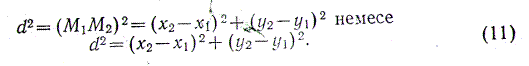 Егер осы нүктелерді басқа ширектерден алсақ та, (11) формула өзгермейді, өйткені координаталардың айырымдары (х2—х1), (у2 – у1) қандай таңбалы сандар болса да, олардың квадраттары (х2—х1)2, (у2 – у1)2 ылғи оң таңбалы сандар болады.