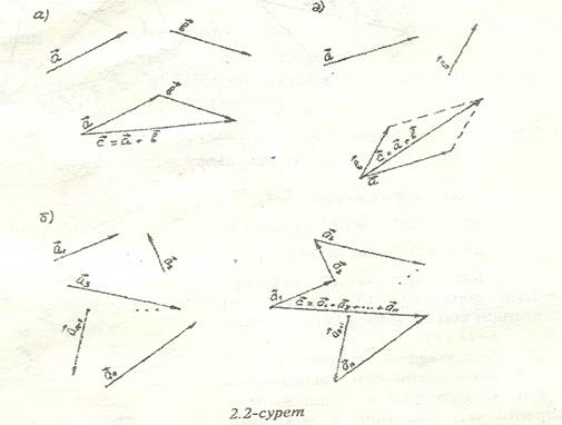 векторларының қосындысын алу үшін біріншісінен бастап ұзындықтары мен бағыттарын сақтай отырып, тізбектеп жалғау арқылы, бірінші вектордың бас, n-ші вектордың соңғы нүктелерін қосып, «көпбұрышты тұйықтау ережесінң қолданамыз (1.4в-сурет).