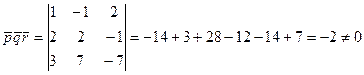 кеңістікте базис құрайтын болса, онда есептің шешімі болады. Бұл векторлар базис құру үшін олардың компланар болмауы керек. Сондықтан ол векторлардың аралас көбейтіндісін есептейік: