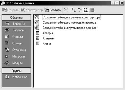 Окно базы данных – одно из основных окон Access. В этом окне находится панель Объекты с кнопками для всех объектов БД. Нажав нужную кнопку, можно приступить к созданию соответствующего объекта. В окне БД также находится своя панель инструментов, содержащая кнопки основных команд меню системы. Из других окон Access можно перейти в окно БД с помощью кнопки F11.