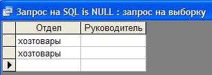 Пример 2. Выбор с условием. Вывести названия таких отделов таблицы СЛУЖАЩИЕ, в которых в данный момент отсутствуют руководители. Оператор SELECT для этого запроса можно записать так: