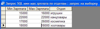 Пример 3. Выбор с группированием. Пусть требуется найти минимальную и максимальную зарплаты для каждого из отделов (по таблице СЛУЖАЩИЕ). Оператор SELECT для этого запроса имеет вид: