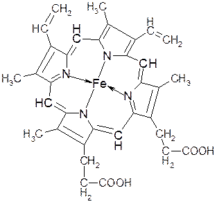 Это плоская ароматическая структура с чередующимися двойными связями, 18 электронов находятся в сопряжении. Координационное железо равно 6, одна координационная связь связывается с гистедином-57 белковой молекуле, еще две другие связаны с кислородом координационно. Железо и в гемоглобине и в оксигемоглобине имеет степень окисления +2. При образовании связи с кислородом гемоглобин меняет конфирмацию белковой молекулы.