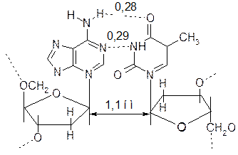 В силу пространственных ограничений соединяться водородными связями могут только вполне определенные основания А с Т и Г с Ц.