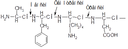 · Ферменты, обладающие абсолютно-групповой специфичностью. Ферменты этой группы действуют на один тип химической связи, но в полнее определенном месте. Например, ферменты пептидазы – расщепляют пептидные связи в белках. Фермент хемотрепсин – расщепляет все белки, но по связи, где C=O группа принадлежит ароматической аминокислоте, а также на стыке ароматической и дикарбоновой аминокислоты.