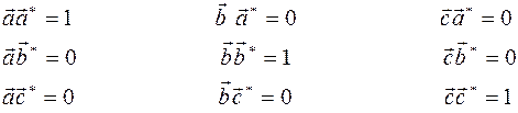 (обратно межплоскостному расстоянию этого семейства плоскостей). Для векторов кристаллической решетки и обратной решетки должны выполняться условия: скалярные произведения: