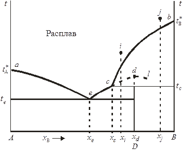 Из всех расплавов, точки составов которых располагаются на кривой от точки е (эвтектики) до точки с (перитектической), кристаллизуется химическое соединение D. Если состав системы xi, то процесс выделения кристаллов В по линии bc будет завершаться при tс с образованием химического соединения D и исчезновением кристаллов B. Дальнейшее