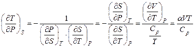Другой пример: требуется определить, как изменится температура жидкости в результате ее адиабатического обратимого сжатия. Обратимый адиабатический процесс является изоэнтропийным, поэтому необходимо оценить производную