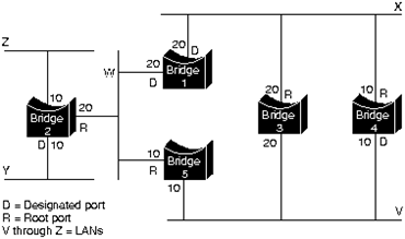 В деяких випадках два або більш мостів можуть мати однакові витрати кореневого тракту. Наприклад, на Мал. 29-3 як Міст 4, так і Міст 5 можуть досягти Міст 1 (кореневий міст) з витратами тракту 10. В цьому випадку знову використовуються ідентифікатори моста, цього разу для визначення назначеных мостів. При виборі перевага віддана порту LAN V Моста 4 перед портом LAN V Моста 5.