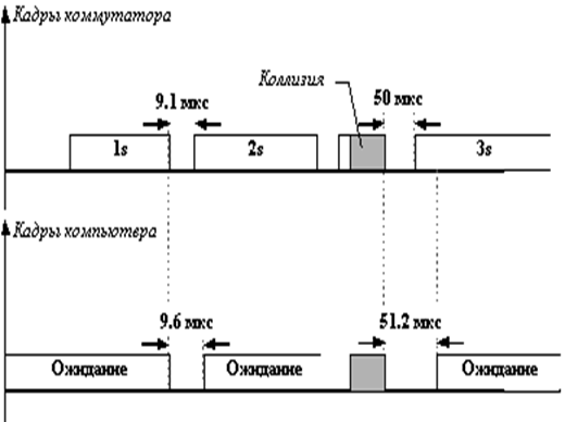 В першому випадку комутатор закінчив передачу чергового кадру і замість технологічної паузи в 9.6 мкс зробив паузу в 9.1 мкс і почав передачу нового кадру. Комп'ютер не зміг захопити середовище, оскільки він витримав стандартну паузу в 9.6 мкс і знайшов після цього, що середовище вже зайнято.