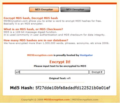 Наприклад, скориставшись сайтом md5encryption.com, зашифруємо вираз “wi-fi”: